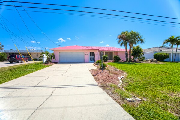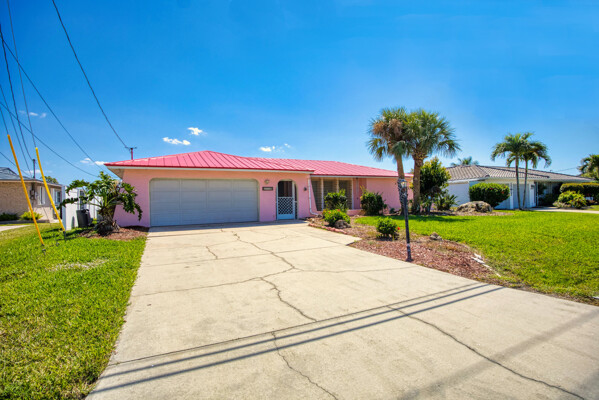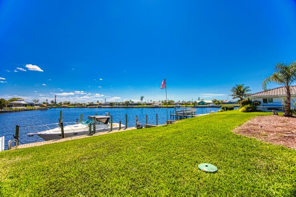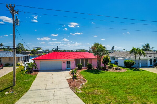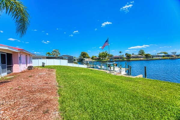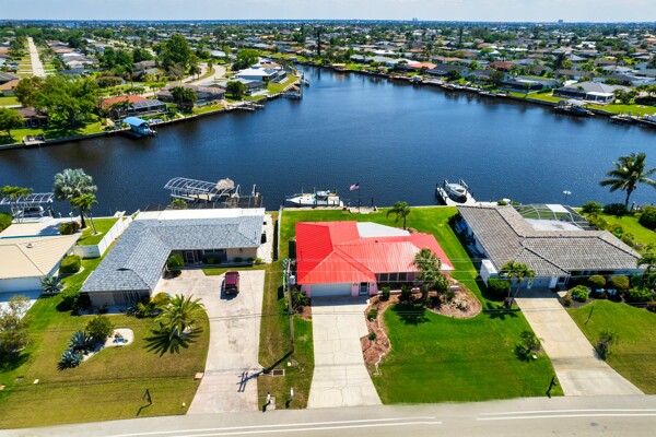 Discover the potential in this well-located Cape Coral home, perfectly positioned on a high ridge with stunning views of the Rubicon Basin. Just a short ride to the Caloosahatchee River and with direct Gulf access, this property is a boater's dream with only one bridge to gulf access with 11.3 ft clearance. The eastern-facing lot welcomes beautiful morning sun while offering afternoon shade—ideal for comfortable outdoor living. The home features a new metal roof in 2023, new A/C system in 2024, new hot water heater in 2022, and hurricane shutters, plus a transferable flood policy currently under $1,000 annually. A generator hookup and inground propane tank already in place provide added peace of mind. There's plenty of room to add a pool and customize your backyard oasis. This property has been owned by the same family for years and is now ready for its next chapter. Whether you're looking to renovate, rebuild, or invest, the lot and location alone offer incredible long-term value—with no HOA fees and direct access to Florida’s most sought-after waterways.